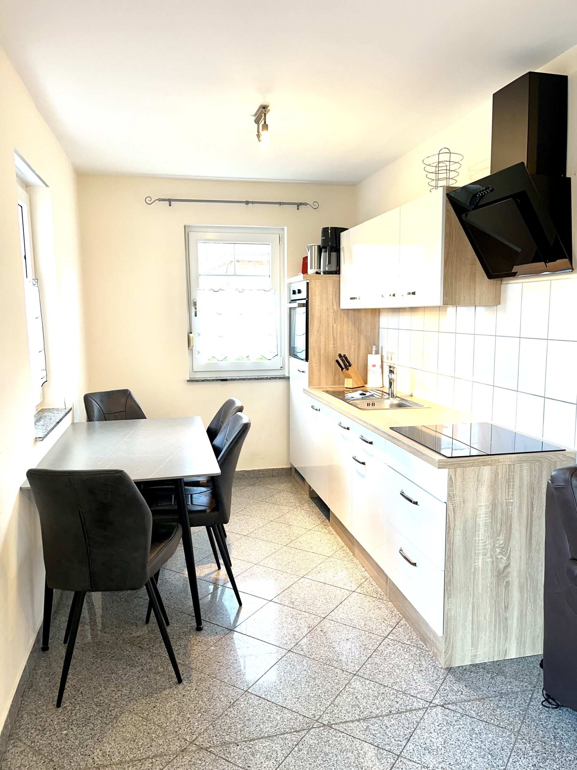 mit Gefrierfach, Toaster,Kaffeemaschine und Wasserkocher) - ein Essbereich mit Tisch, 4 Stühle