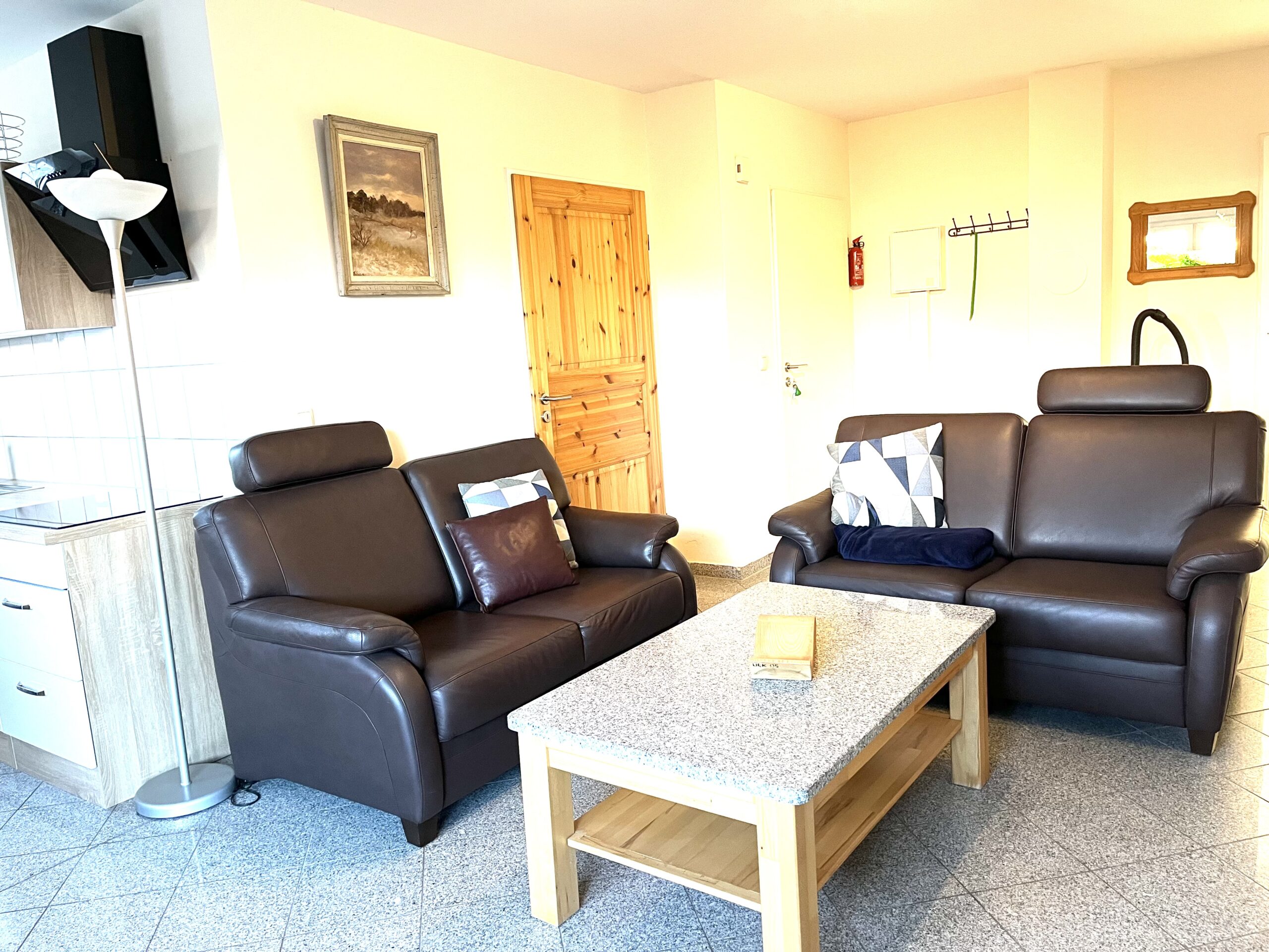 - ein Wohnzimmer mit Ledercouch und zwei Sessel, Anrichte,